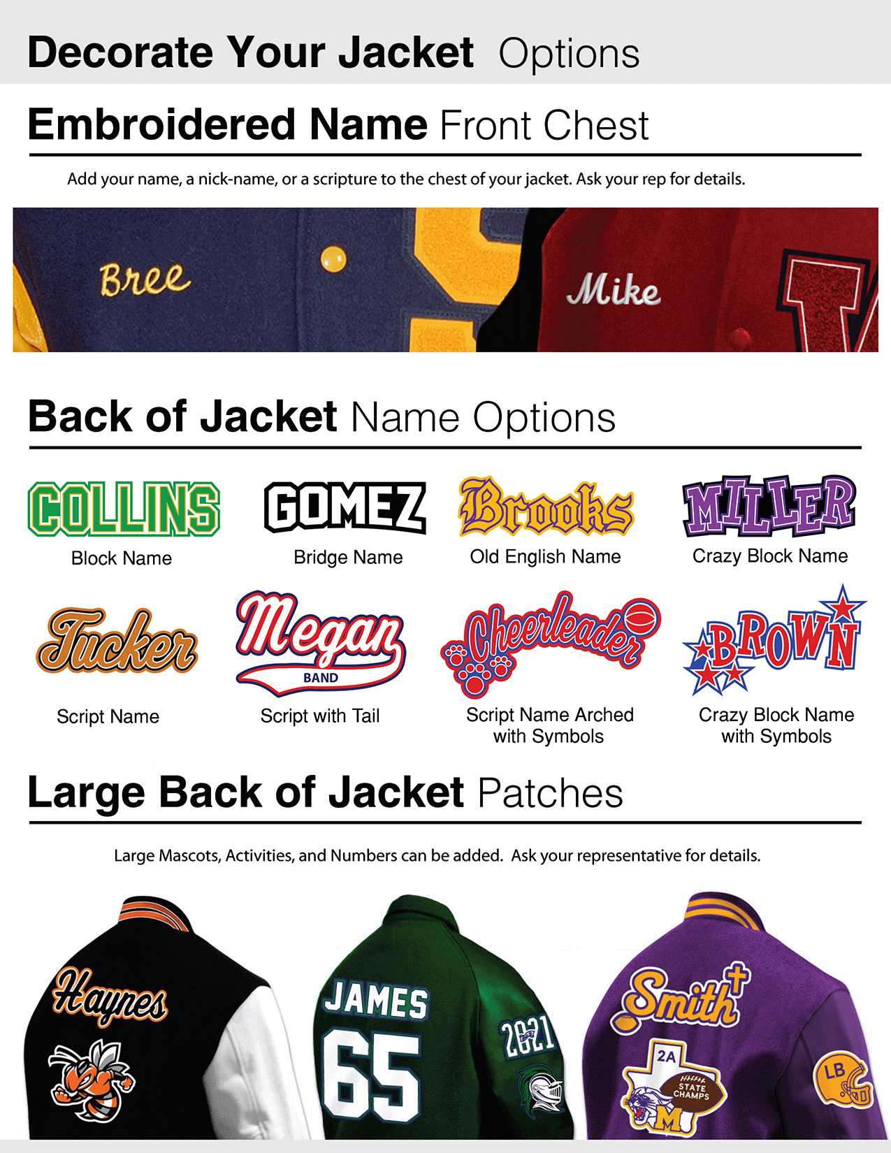 Base jacket price includes jacket with letter attached, script name embroidered on front, 4" mascot sleeve patch, 4” gradyear sleeve patch and leather sleeves.