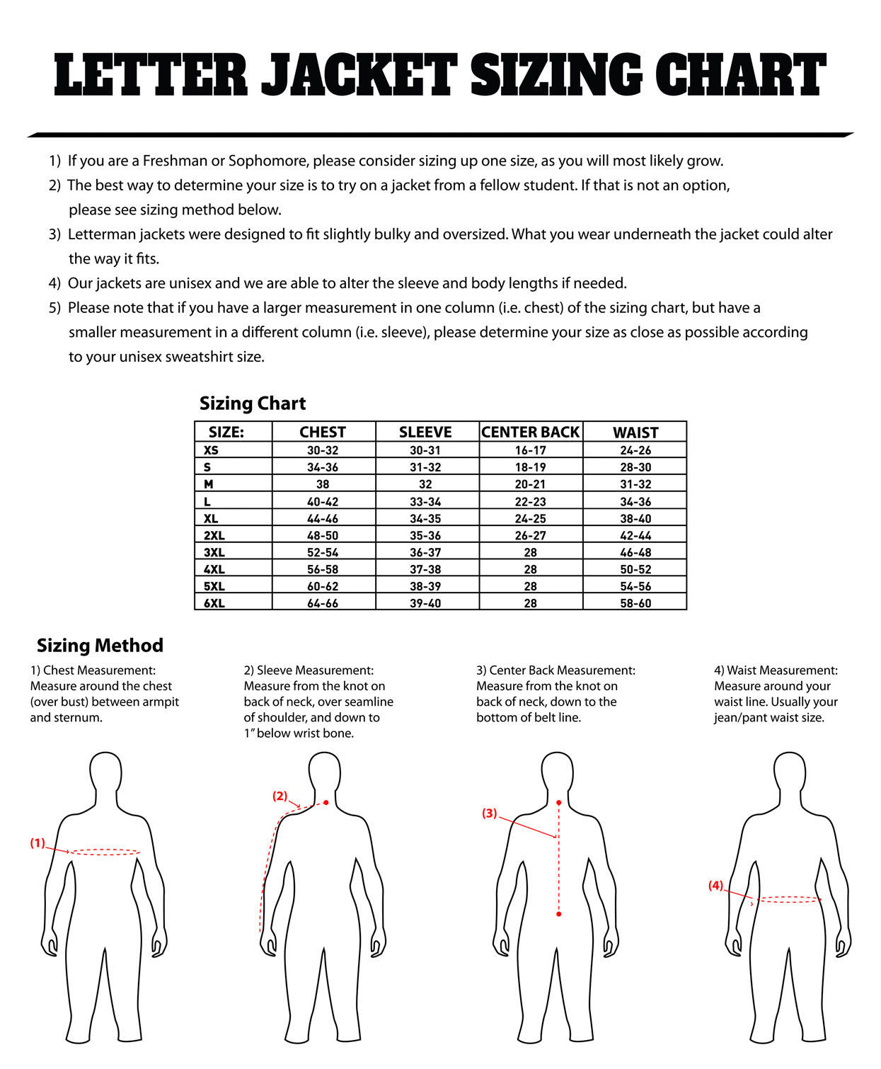 Jacket sizes are unisex. If you are unsure of your size, a representative can size you during one of our in-school order days.