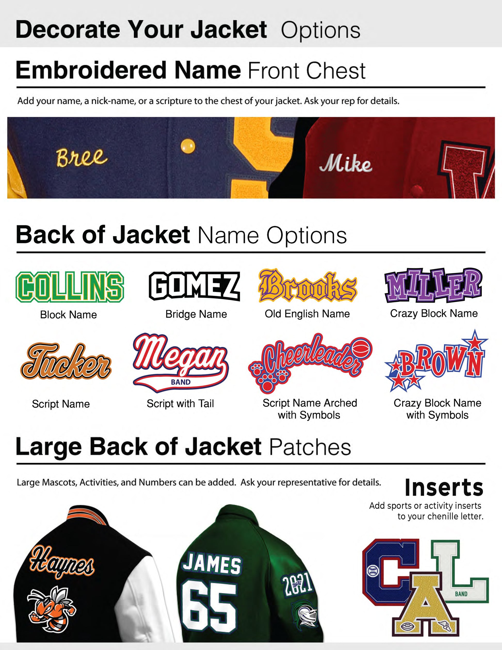 Base jacket price includes jacket with letter attached, script name embroidered on front, 4" mascot sleeve patch, 4” gradyear sleeve patch and leather sleeves.